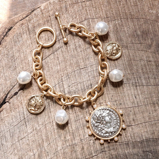 Boho Coin and Pearl Charms Statement Bracelet β Gold and Silver Tone