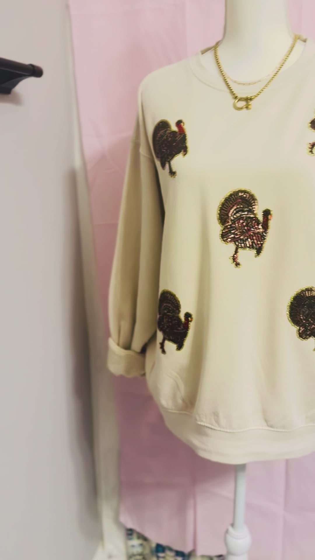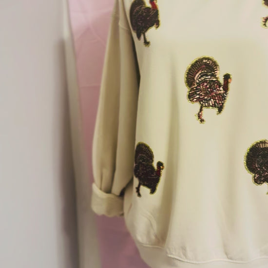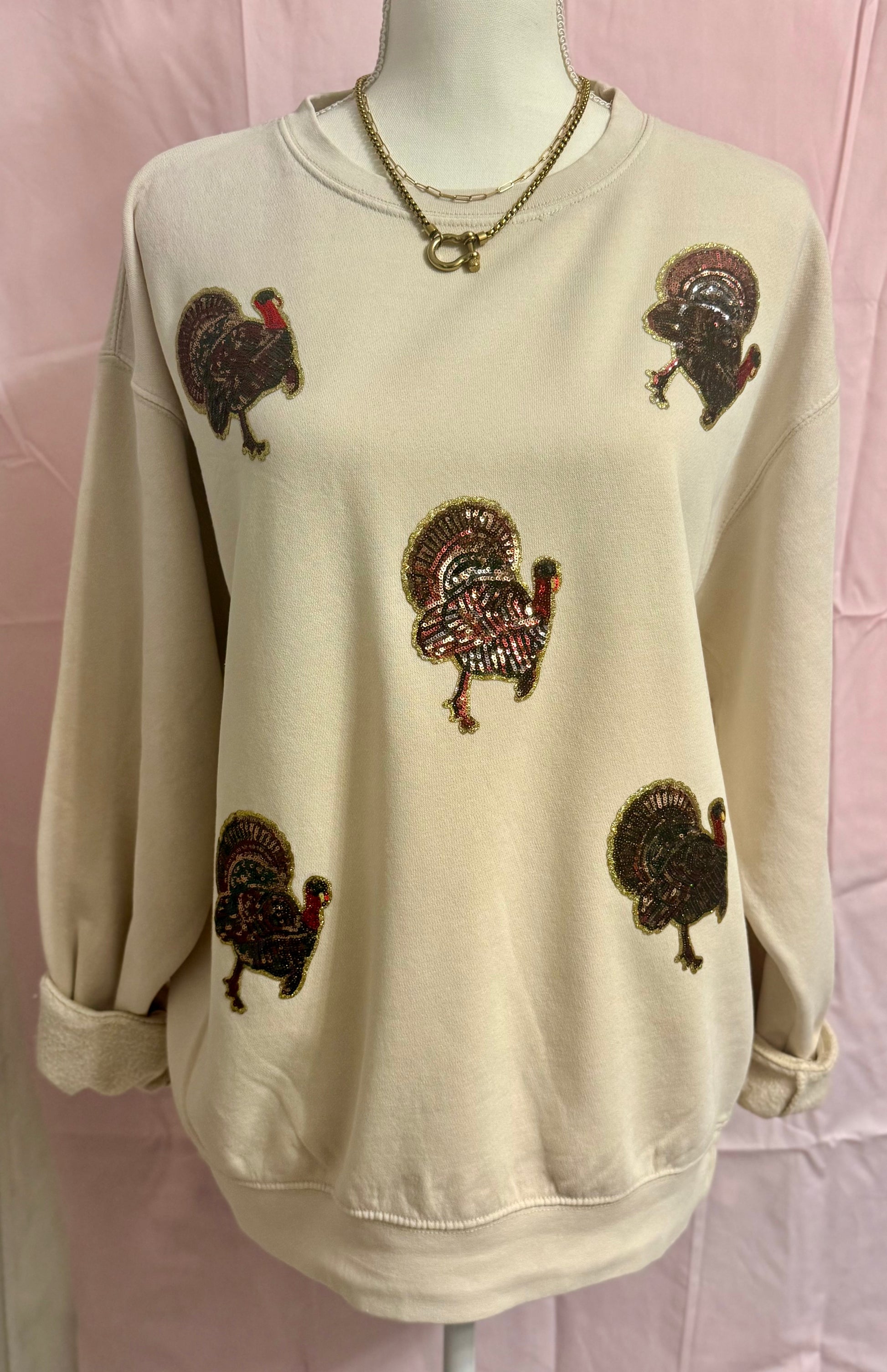 Real sequins little turkeys scattered all around this vi rage washed sweatshirt that’s as soft as the butter you’ll be putting on your roll come Thanksgiving day!!